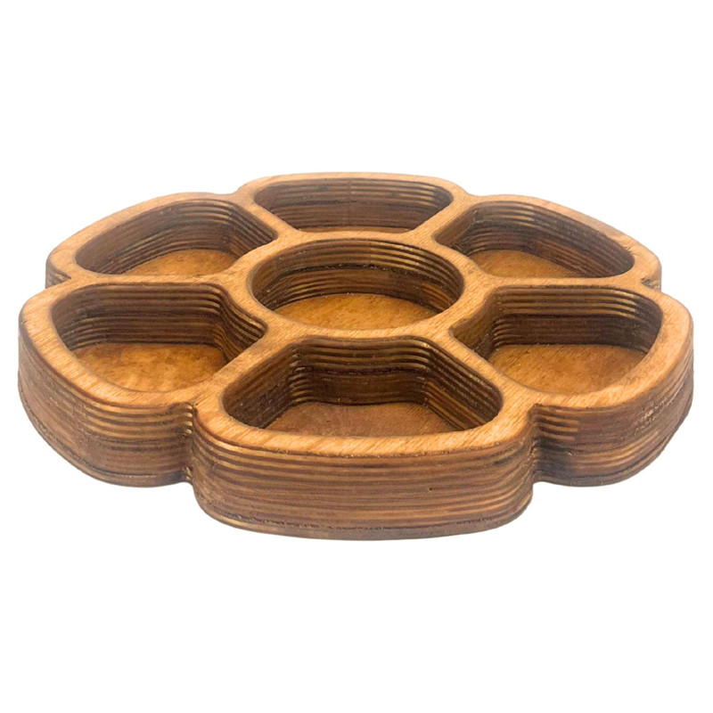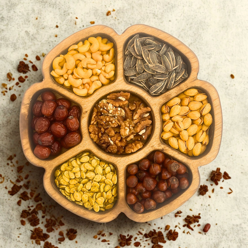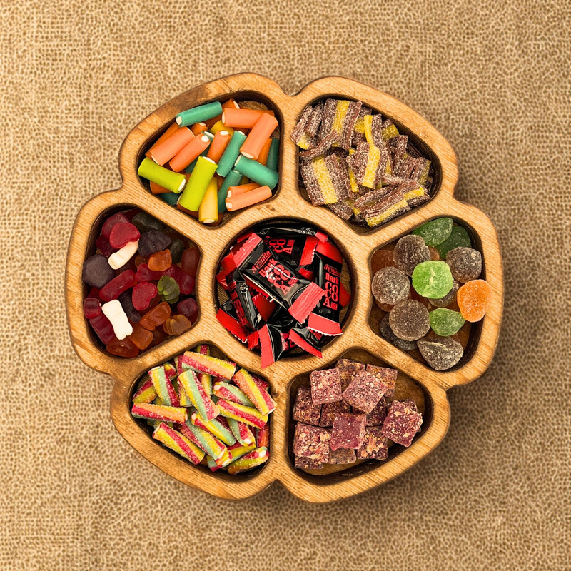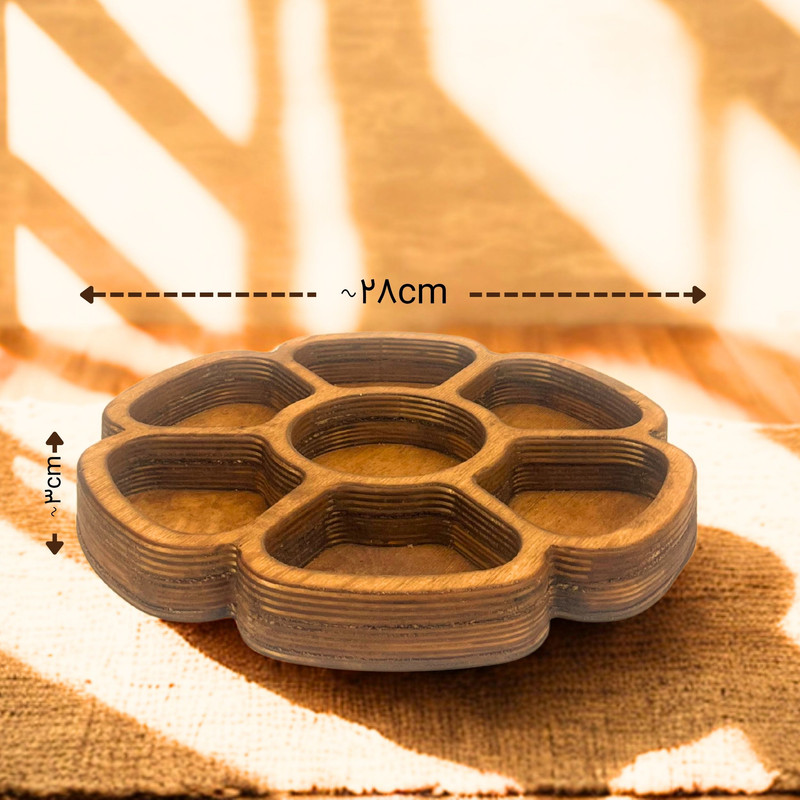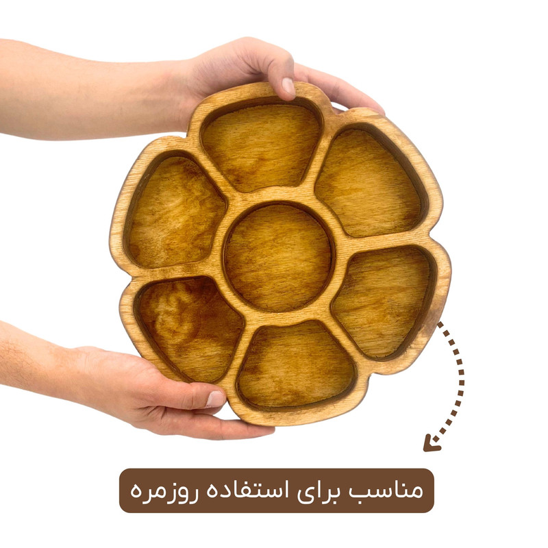 این اردوخوری از چوب طبیعی و مرغوب ساخته شده و دارای ۷ محفظهی جداگانه است؛ شش قسمت گلبرگی اطراف و یک قسمت دایرهای در مرکز. این طراحی نهتنها جلوهای چشمنواز دارد، بلکه کاربردی هم هست و شما میتوانید انواع آجیل، شکلات، پاستیل، خشکبار، یا مزههای مختلف را به شکلی منظم و شکیل در آن بچینید.