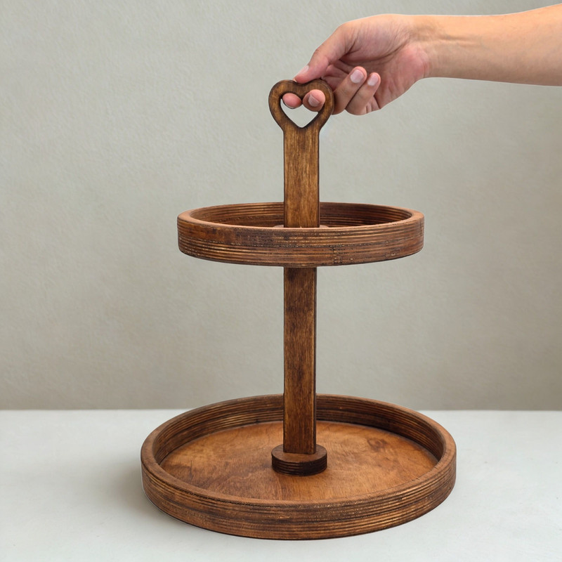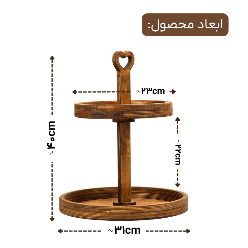 این استند از چوب طبیعی با کیفیت بالا ساخته شده و به صورت دو طبقه طراحی شده است. طراحی دستهی این شیرینیخوری با الهام از فرم قلب انجام شده که به آن زیبایی و حس لطافت خاصی میبخشد. شکل طبقات کاملاً دایرهای است و با ارتفاع مناسب، استفادهی آسان و چیدمانی مرتب از اقلام را ممکن میسازد.