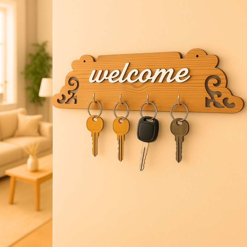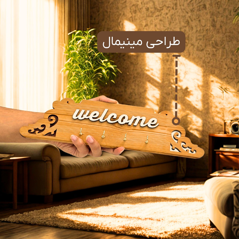 بدنه این جا کلیدی از چوب طبیعی تهیه شده است که حس گرما، اصالت و نزدیکی به طبیعت را به فضای داخلی منتقل میسازد. در قسمت جلویی محصول، عبارت برجستهی «WELCOME» با فونتی زیبا و خوانا درج شده است که حس دلنشینی از خوشامدگویی را به فضا القا میکند. این ویژگی موجب میشود که این جا کلیدی، علاوه بر کارکرد اصلی خود، بهعنوان یک المان تزئینی نیز مورد توجه قرار گیرد.