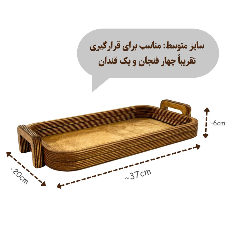 یکی از این ظروف پذیرایی، سینی چوبی مدل SN05 است. این مدل سینی در 3 سایز مختلف عرضه می شود مدل SN052 سایز متوسط آن است و ابعاد آن به ترتیبِ طول ، عرض و ارتفاع در حدود 37 ، 20 و 6 سانتی متر و وزن آن معادل 470 گرم است.