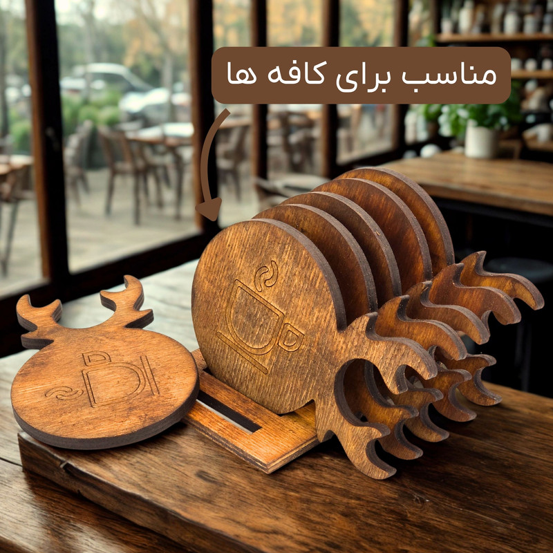 زیرلیوانیها دارای طراحی خاص با دستههایی به شکل شاخ گوزن هستند که نمایی مدرن و در عین حال طبیعتگرا به فضا میبخشند. استند چوبی همراه با این پک نیز امکان نظمدهی و نگهداری راحت را فراهم میکند.