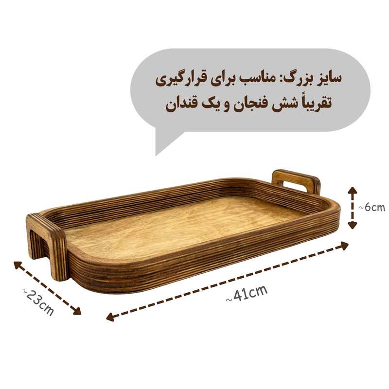 یکی از این ظروف پذیرایی، سینی چوبی مدل SN05 است. این مدل سینی در 3 سایز مختلف عرضه می شود مدل SN053 سایز بزرگ آن است و ابعاد آن به ترتیبِ طول ، عرض و ارتفاع در حدود 41 ، 23 و 6 سانتی متر و وزن آن معادل 550 گرم است.