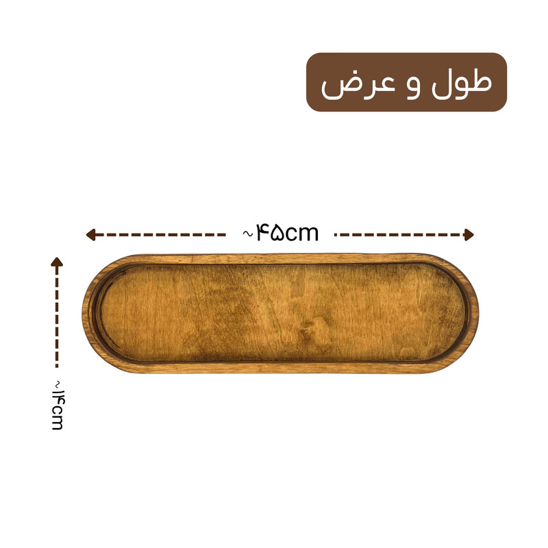 ابعاد این سینی ۴۵ سانتیمتر طول، ۱۴ سانتیمتر عرض و ۲ سانتیمتر ارتفاع است. ابعادی کاملاً ایدهآل برای سرو رولت، کیکهای برشخورده، دسر، فینگر فود یا سرو چای و قهوه. این سینی بهخصوص برای کافهها انتخابی عالیست؛ زیرا هم طراحی آن شیک و حرفهایست و هم حس صمیمیت و طبیعت را به مشتریان منتقل میکند.
