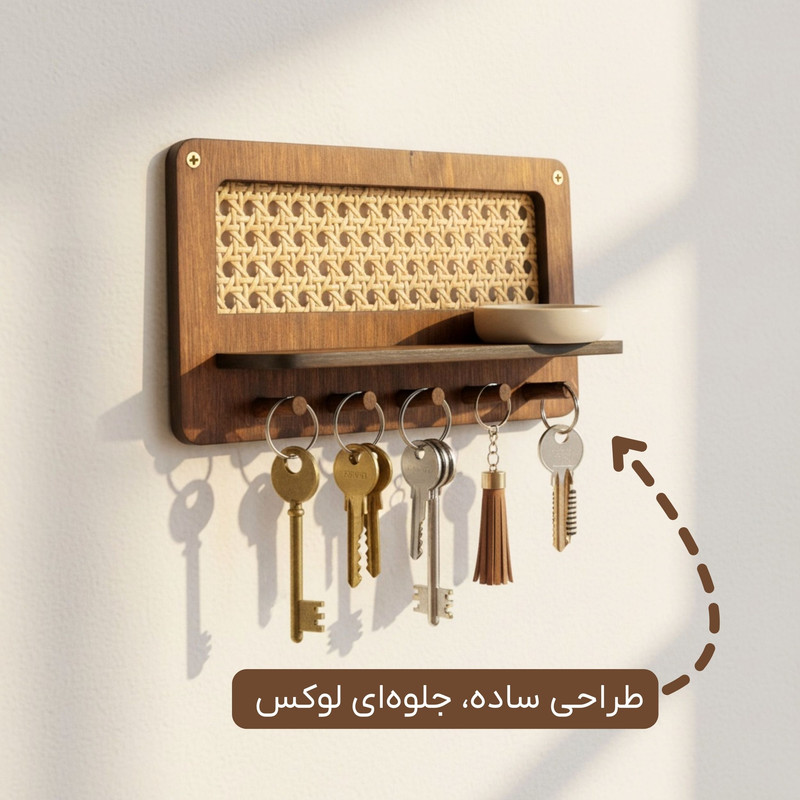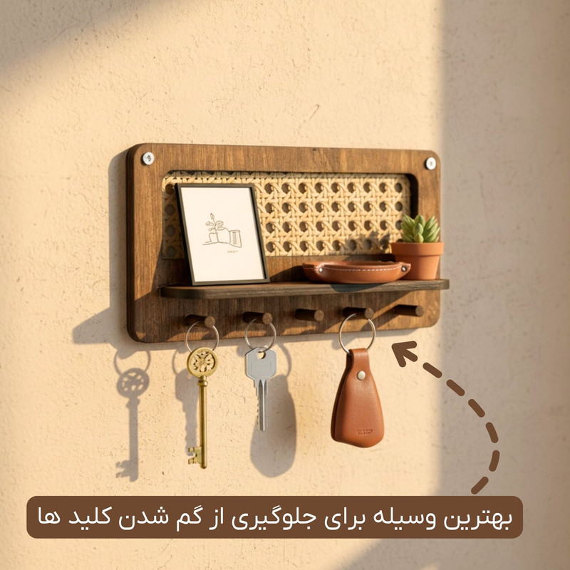 کاربردها و مزایا وجود چند قلاب فلزی یا چوبی در بخش پایینی، امکان آویزان کردن کلیدهای مختلف مانند کلید خانه، خودرو یا حتی لوازم جانبی کوچک را فراهم میکند. همچنین سطح بالایی محصول میتواند بهعنوان طاقچهای کوچک برای قرار دادن وسایلی مانند شمع تزئینی، عطر جیبی یا یادداشتهای روزانه استفاده شود.