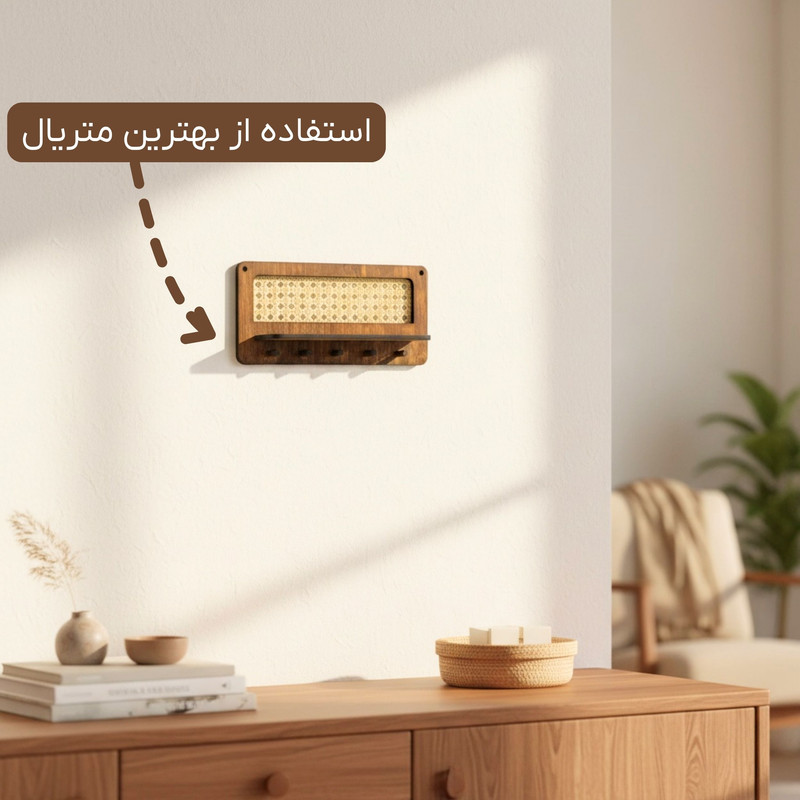 طراحی حصیری با ترکیب چوب و هنر بخش مرکزی محصول با طرح حصیری تزئین شده که جلوهای سنتی و در عین حال مدرن دارد. این طراحی باعث میشود جا کلیدی بهراحتی با انواع سبکهای دکوراسیون، از مینیمال گرفته تا روستیک و کلاسیک، هماهنگ شود. فرم نیمدایره یا قوسدار بالای محصول نیز به زیبایی آن افزوده و حس هنری و دستساز بودن را تقویت میکند.