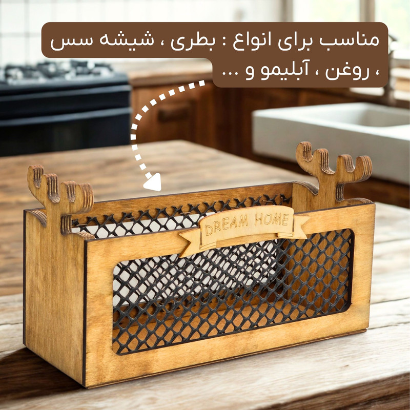 مناسب برای هدیه و جهیزیه | مناسب برای نظم دادن به ظروف روغن، سرکه و سس ها | ساخته شده از چوب وارداتی با کیفیت | پوشش گیاهی | کاملا بهداشتی، قابل شستشو و آبگریز | ابعاد محصول به ترتیبِ طول، عرض و ارتفاع معادل 34، 14 و 18 سانتیمتر