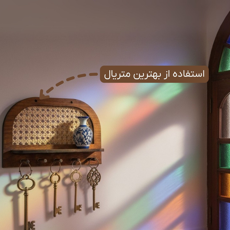 جنس مرغوب و ماندگار بدنهی جا کلیدی از چوب با کیفیت ساخته شده است؛ مقاوم، بادوام و دارای بافتی زیبا که حس صمیمیت و طبیعی بودن را به محیط میبخشد. سطح صیقلی و پرداختشدهی آن علاوه بر زیبایی، تمیز کردن را نیز آسان میسازد. استفاده از چوب مرغوب باعث میشود این محصول در برابر استفادهی روزمره و گذر زمان دوام بالایی داشته باشد.