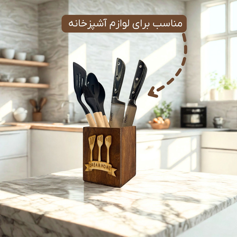 ابعاد این استند برابر است با: طول: ۱۱ سانتیمتر | عرض: ۱۱ سانتیمتر | ارتفاع: ۱۴ سانتیمتر این اندازهی استاندارد باعث میشود فضای کافی برای قرارگیری انواع قاشق، چنگال، کارد و حتی ابزارهای کوچک آشپزی فراهم باشد، بدون اینکه فضای زیادی از سطح کابینت یا میز را اشغال کند.