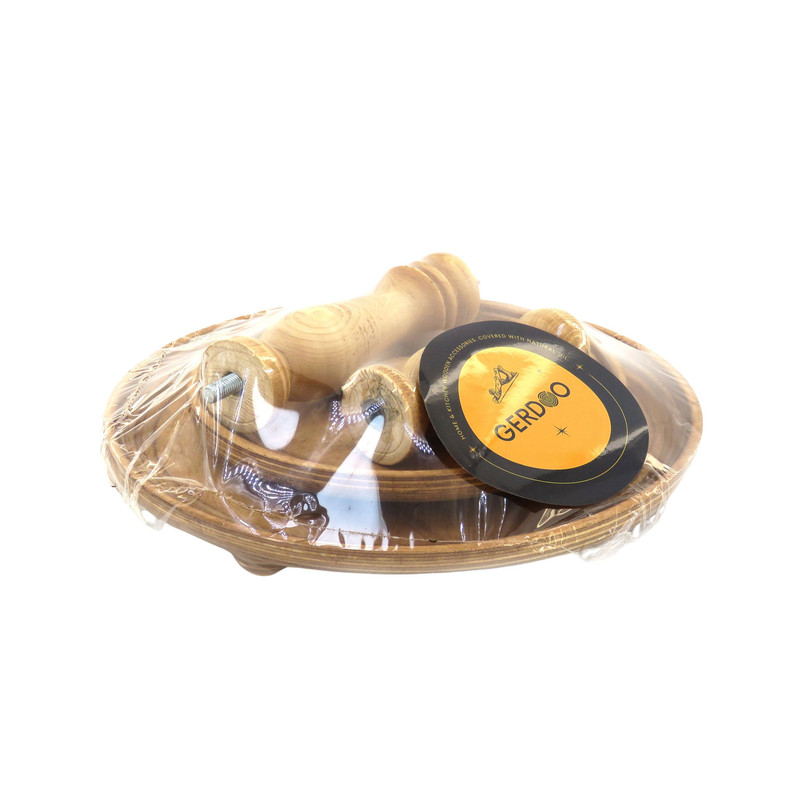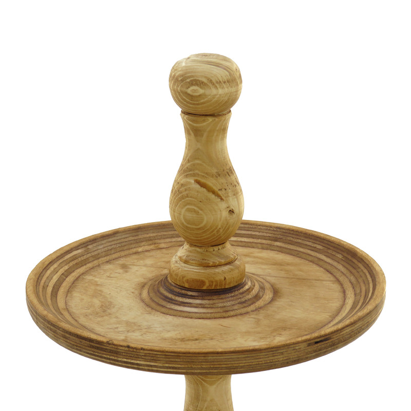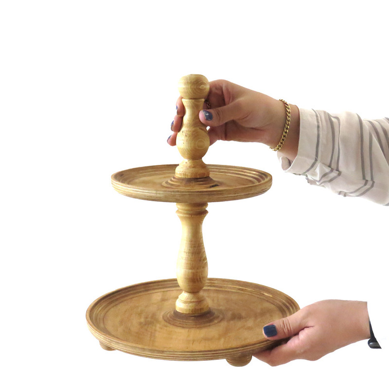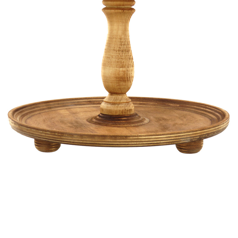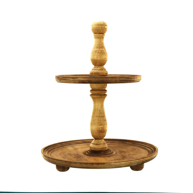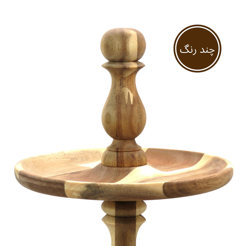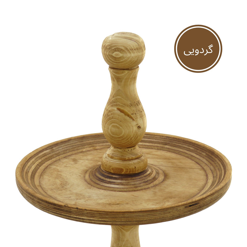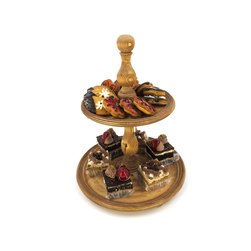 این شیرینی خوری دو طبقه چوبی با قطر 26 سانتیمتر برای طبقه پایین و 19 سانتیمتر برای طبقه بالا، فضایی مناسب برای پذیرایی فراهم میکند و همینطور ارتفاع 32 سانتیمتری آن نیز به زیبایی هرچه تمامتر بر روی میز شما خودنمایی میکند. پایه های خراطی شده ی شیرینی خوری، زیبایی ظاهری چشم نوازی به آن بخشیده و حس اصالت و هنر را به فضای پذیرایی شما منتقل می کند. همچنین پایههای کوچک تعبیه شده در زیر این شیرینی خوری، تعادل و استحکام آن را تضمین میکنند.