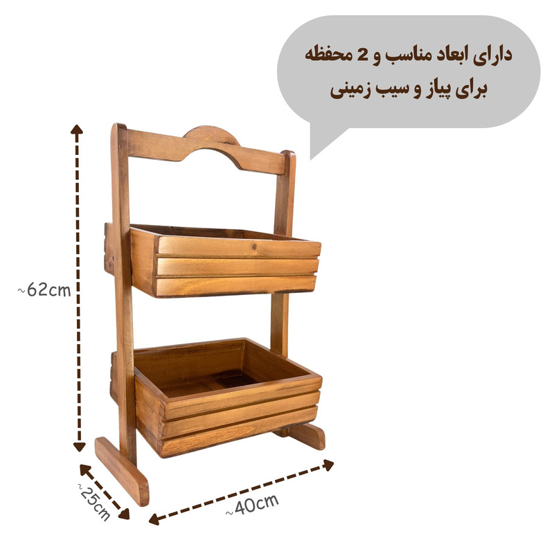 سایر توضیحات: مناسب برای هدیه و جهیزیه | مناسب برای نگهداری سیب زمینی، پیاز و سایر صیفیجات | جنس تماما چوب طبیعی | پوشش بدنه پولیستر با کیفیت | کاملا مقاوم در برابر رطوبت | دارای بسته بندی کاملا بهداشتی | ابعاد به ترتیبِ طول، عرض و ارتفاع معادل 40، 25 و 62 سانتی متر