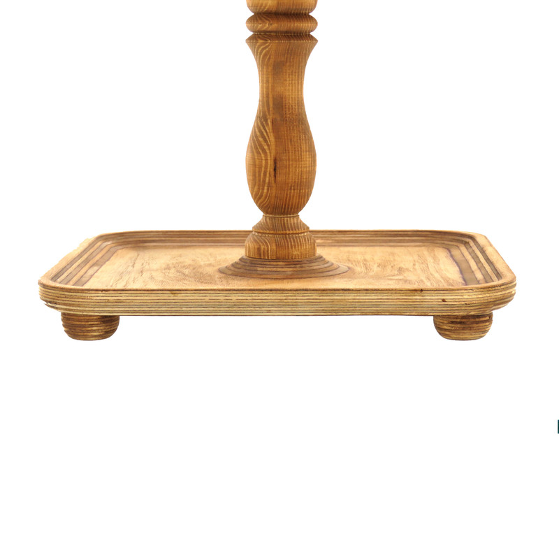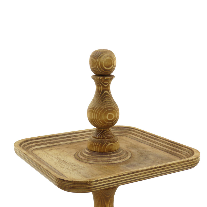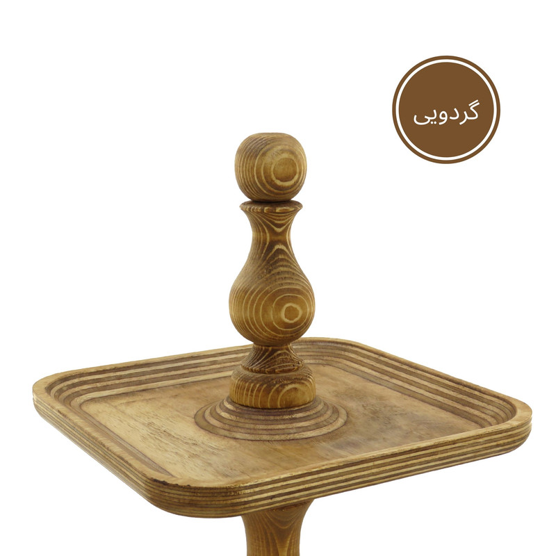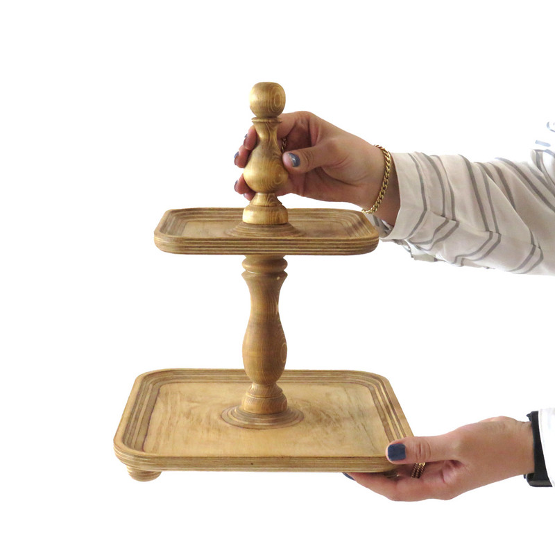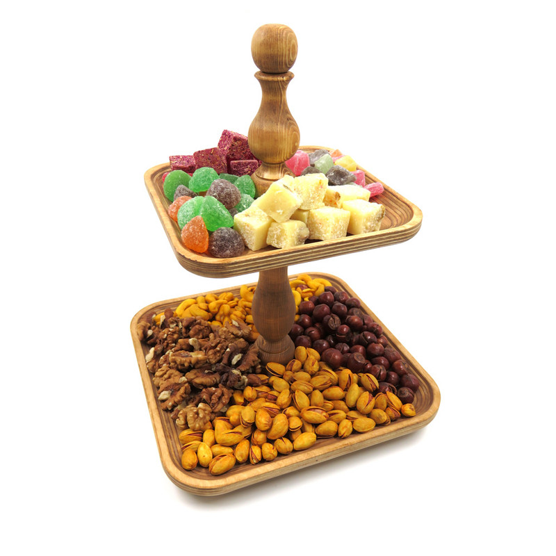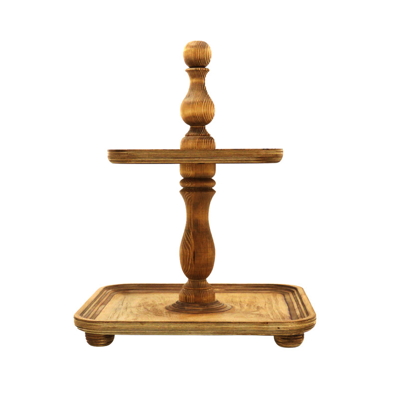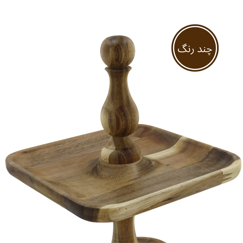 این شیرینی خوری دو طبقه چوبی با ابعاد 24.5 در 24.5 سانتیمتر برای طبقه پایین و 18 در 18 سانتیمتر برای طبقه بالا، فضایی مناسب برای پذیرایی فراهم میکند و همینطور ارتفاع 32 سانتیمتری آن نیز به زیبایی هرچه تمامتر بر روی میز شما خودنمایی میکند. پایه های خراطی شده ی شیرینی خوری، زیبایی ظاهری چشم نوازی به آن بخشیده و حس اصالت و هنر را به فضای پذیرایی شما منتقل می کند. همچنین پایههای کوچک تعبیه شده در زیر این شیرینی خوری، تعادل و استحکام آن را تضمین میکنند.