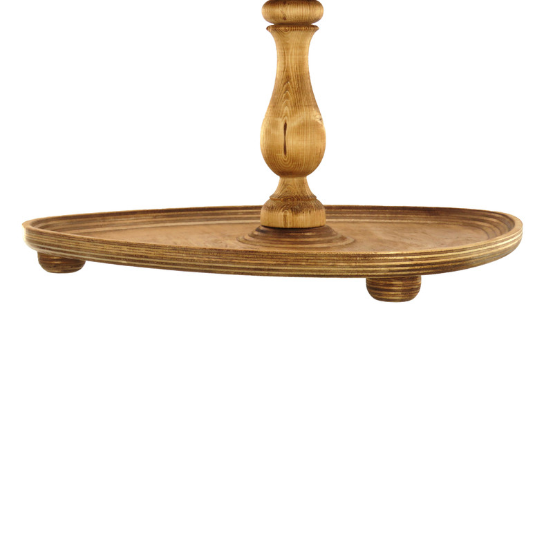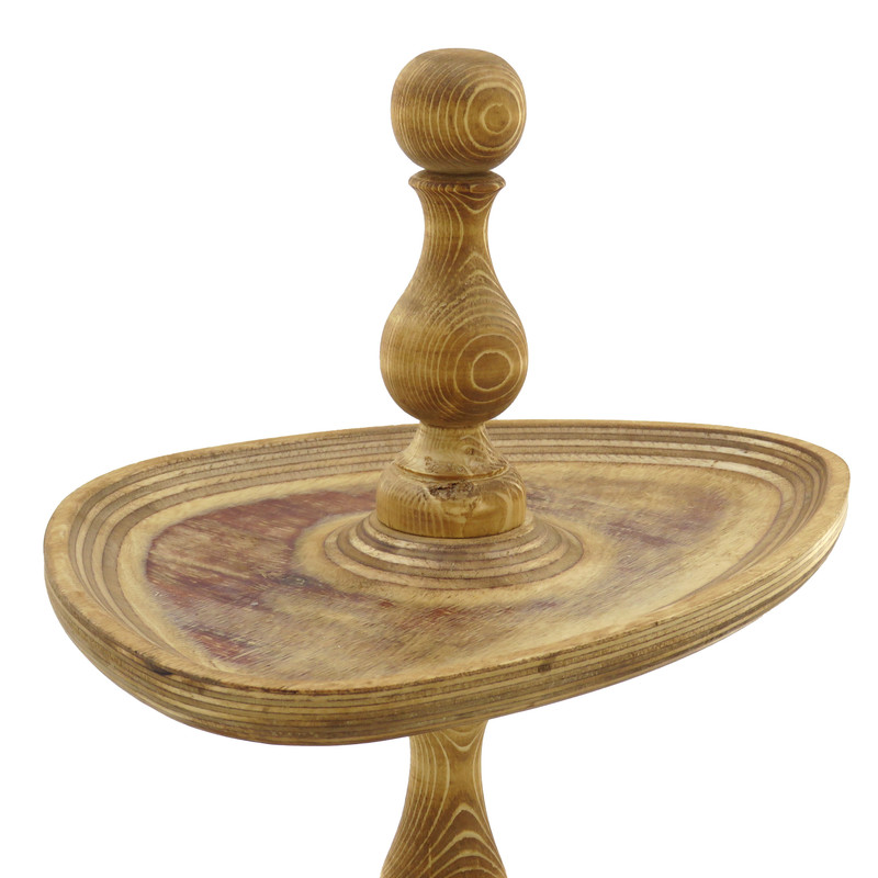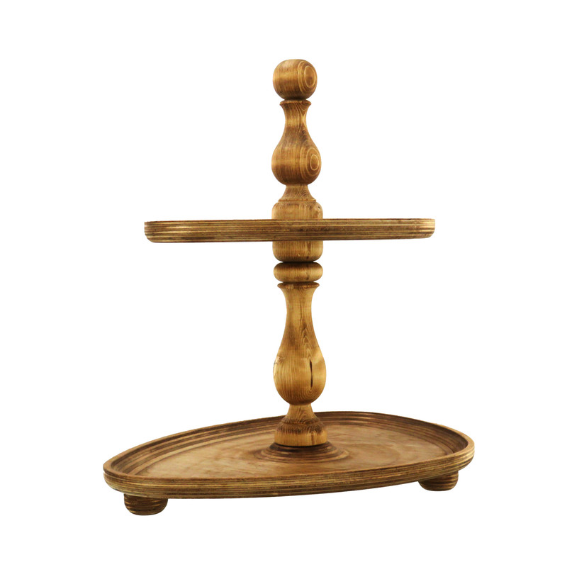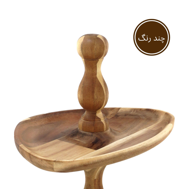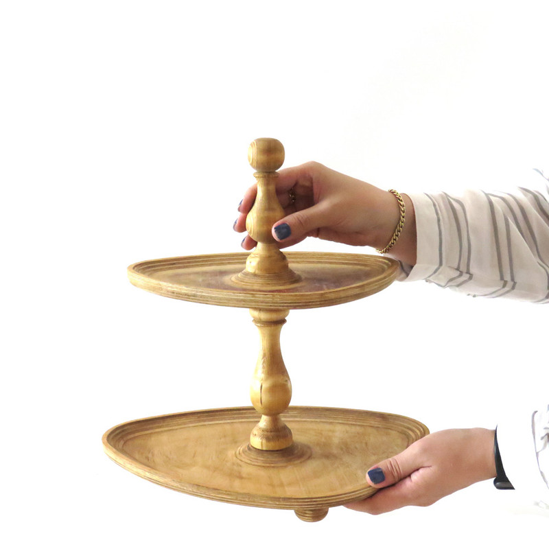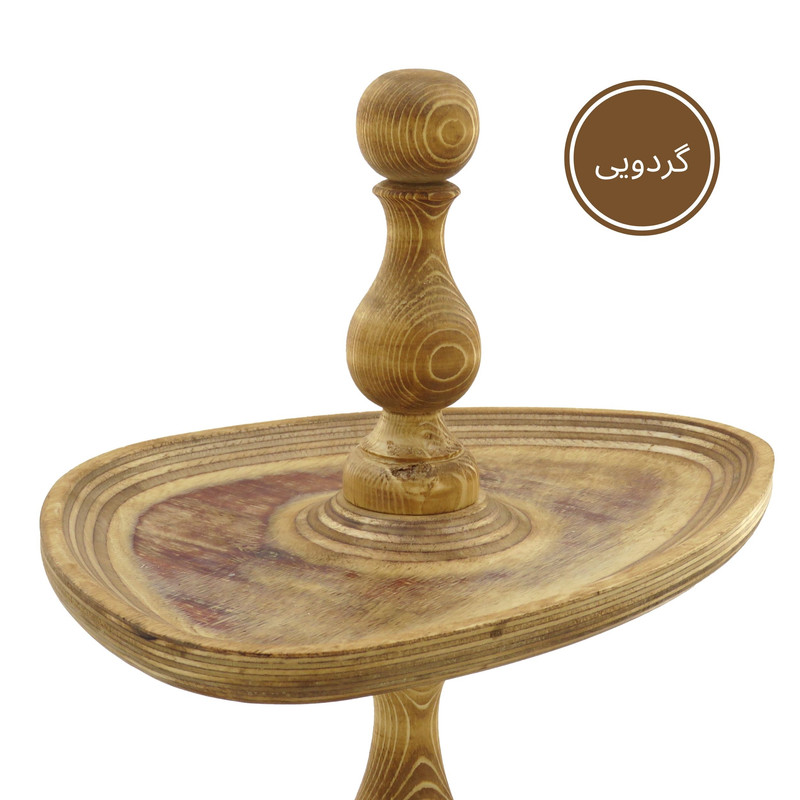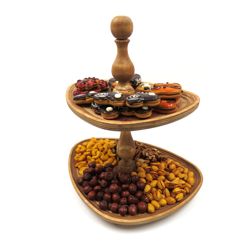 این شیرینی خوری دو طبقه چوبی با ابعاد 32 در 23 سانتیمتر برای طبقه پایین و 25 در 19 سانتیمتر برای طبقه بالا، فضایی مناسب برای پذیرایی فراهم میکند و همینطور ارتفاع 32 سانتیمتری آن نیز به زیبایی هرچه تمامتر بر روی میز شما خودنمایی میکند. پایه های خراطی شده ی شیرینی خوری، زیبایی ظاهری چشم نوازی به آن بخشیده و حس اصالت و هنر را به فضای پذیرایی شما منتقل می کند. همچنین پایههای کوچک تعبیه شده در زیر این شیرینی خوری، تعادل و استحکام آن را تضمین میکنند.
