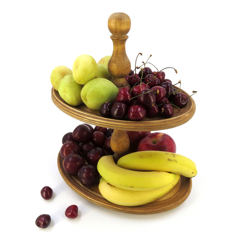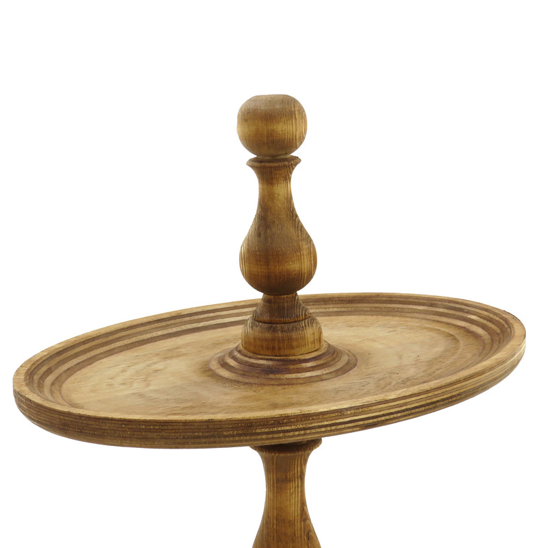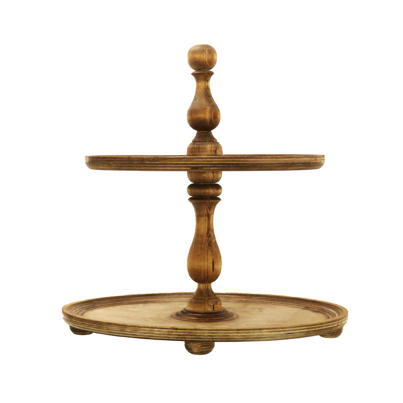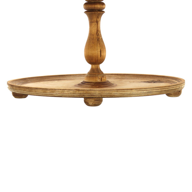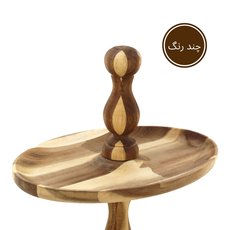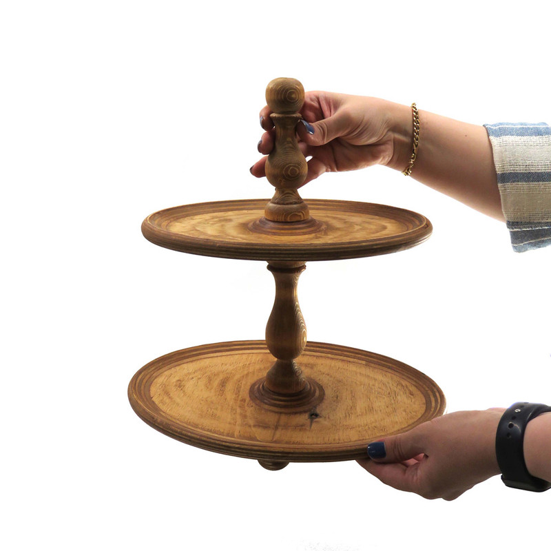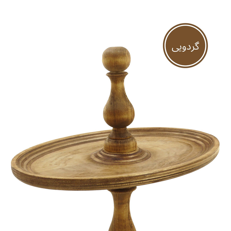 این شیرینی خوری دو طبقه چوبی با ابعاد 32 در 22 سانتیمتر برای طبقه پایین و 23 در 16 سانتیمتر برای طبقه بالا، فضایی مناسب برای پذیرایی فراهم میکند و همینطور ارتفاع 32 سانتیمتری آن نیز به زیبایی هرچه تمامتر بر روی میز شما خودنمایی میکند. پایه های خراطی شده ی شیرینی خوری، زیبایی ظاهری چشم نوازی به آن بخشیده و حس اصالت و هنر را به فضای پذیرایی شما منتقل می کند. همچنین پایههای کوچک تعبیه شده در زیر این شیرینی خوری، تعادل و استحکام آن را تضمین میکنند.