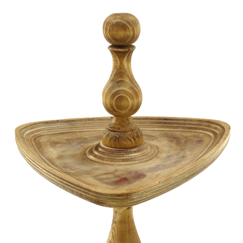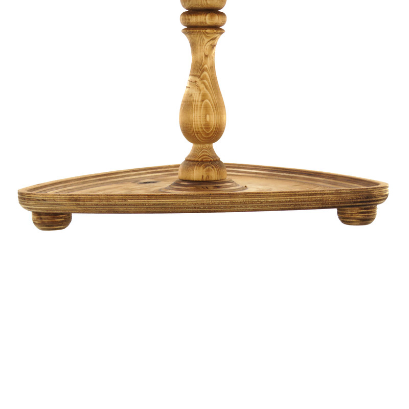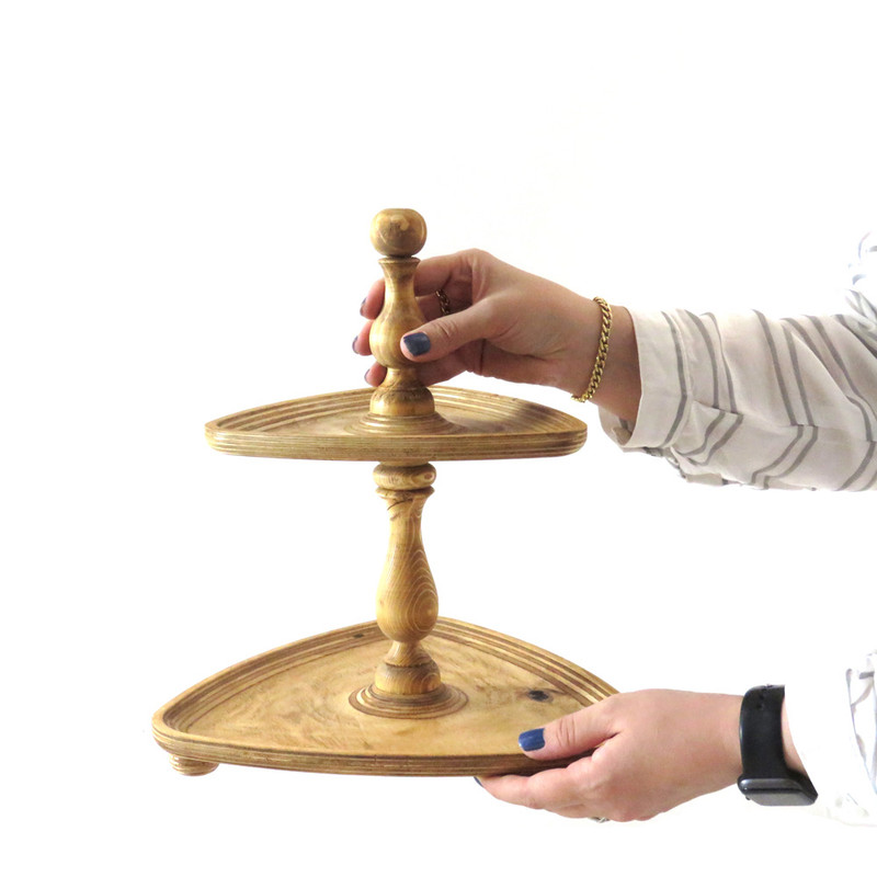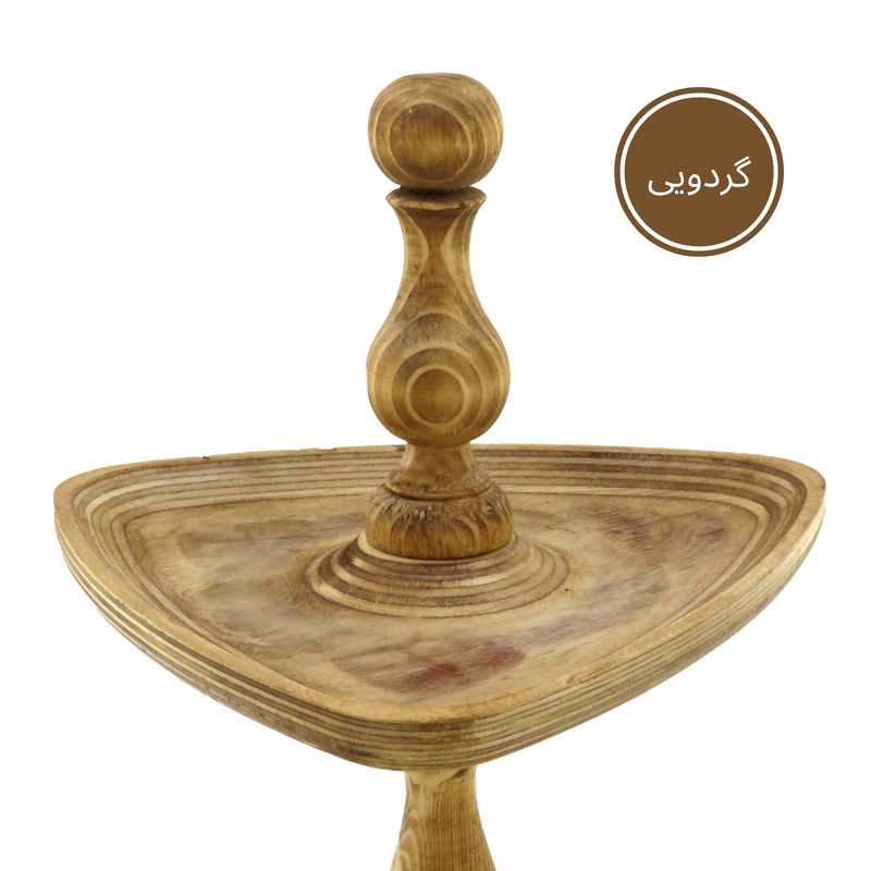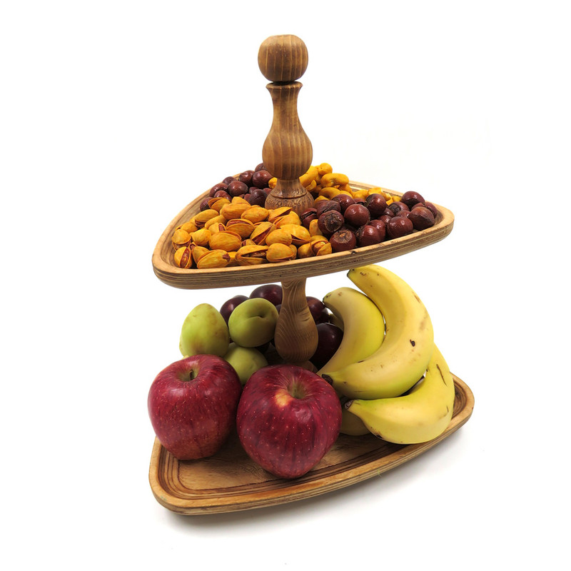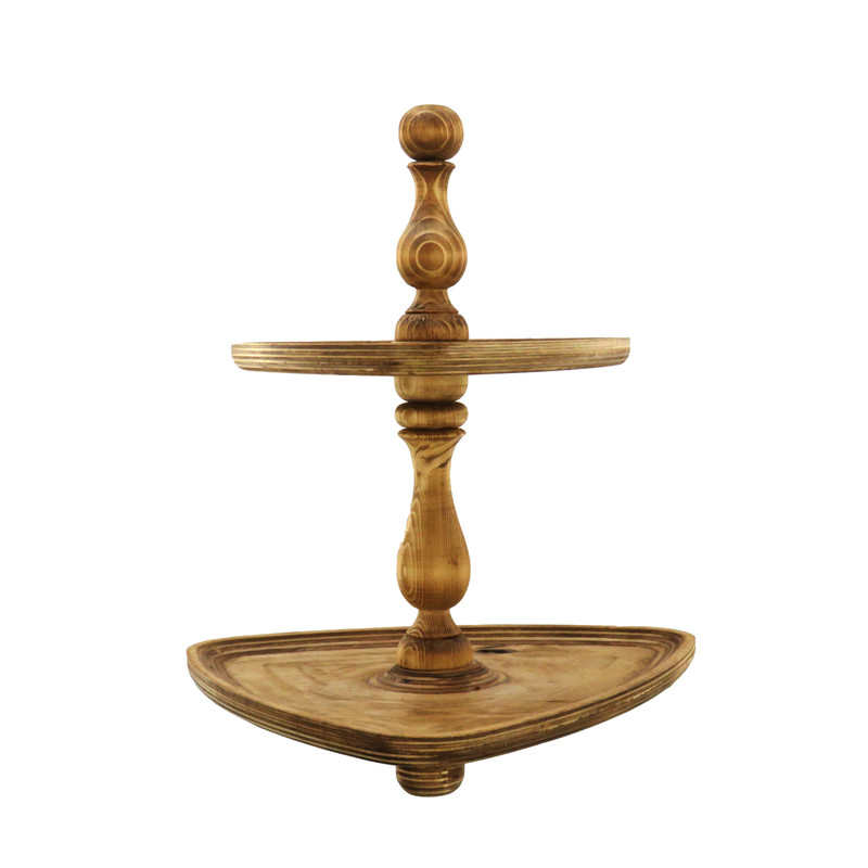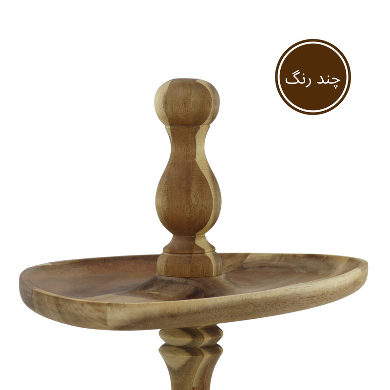 این شیرینی خوری دو طبقه چوبی با ابعاد 28 در 28 سانتیمتر برای طبقه پایین و 21 در 21 سانتیمتر برای طبقه بالا، فضایی مناسب برای پذیرایی فراهم میکند و همینطور ارتفاع 32 سانتیمتری آن نیز به زیبایی هرچه تمامتر بر روی میز شما خودنمایی میکند. پایه های خراطی شده ی شیرینی خوری، زیبایی ظاهری چشم نوازی به آن بخشیده و حس اصالت و هنر را به فضای پذیرایی شما منتقل می کند. همچنین پایههای کوچک تعبیه شده در زیر این شیرینی خوری، تعادل و استحکام آن را تضمین میکنند.